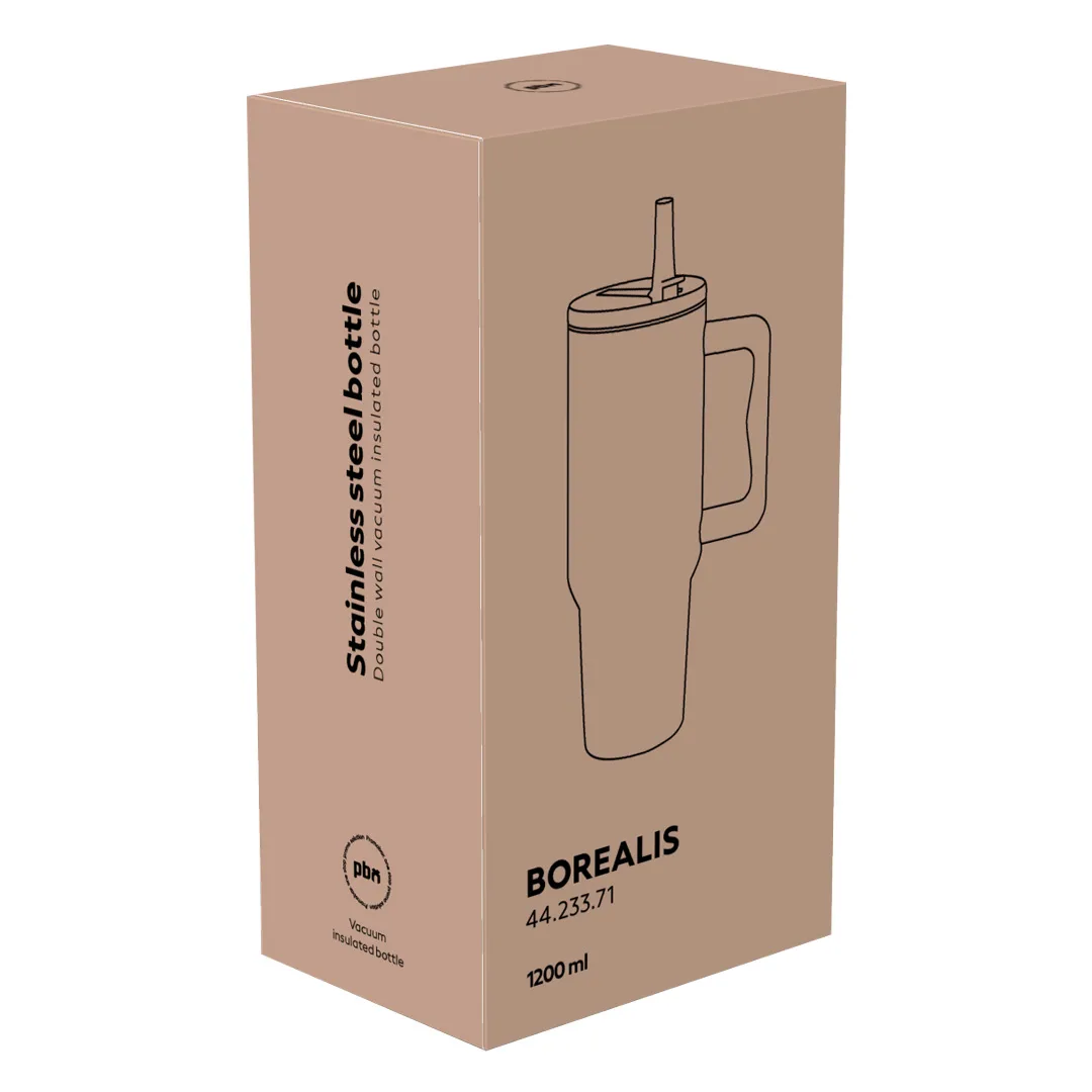 BOREALIS je termos boca najvećeg kapaciteta u ponudi – čak 1200 ml, namenjena korisnicima kojima je potrebna dugotrajna hidratacija tokom celog dana. Posebno je pogodna za outdoor aktivnosti, treninge, duža putovanja i boravak u prirodi, gde veća zapremina predstavlja ključnu prednost. Boca je opremljena integrisanom ručkom za nošenje, kao i slamkom i pijaćim nastavkom, što omogućava praktično konzumiranje napitaka u pokretu. Zahvaljujući vakuum izolaciji i robusnoj izradi od nerđajućeg čelika, BOREALIS pouzdano održava temperaturu napitaka i dolazi u poklon pakovanju, spremna za lasersko brendiranje i promotivne namene.