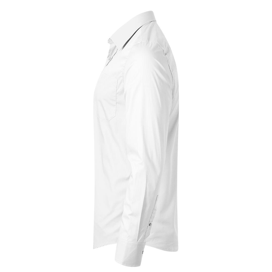 Muška košulja, klasičan kroj, sa lajsnom, džep sa leve strane grudi, sedam dugmadi napred, tri dugmeta na manžetnama, rezervna dugmad, sva dugmad u boji košulje, lako peglanje i održavanje