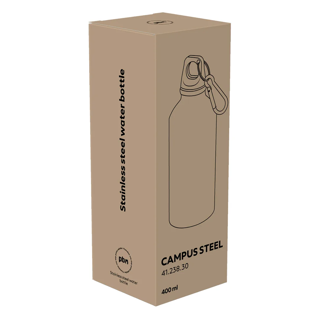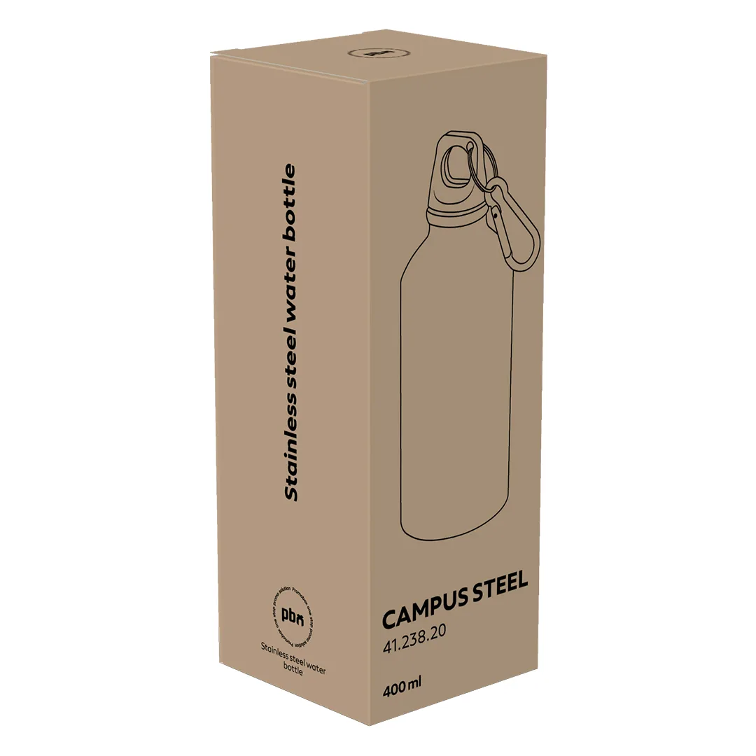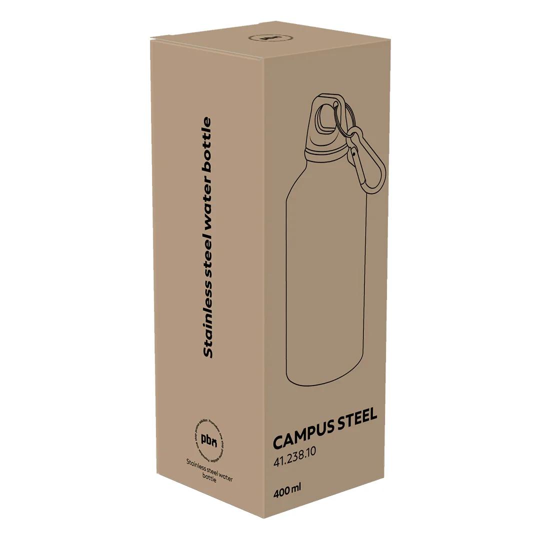 CAMPUS STEEL predstavlja najnoviji dodatak našoj Campus kolekciji i potpuni novitet u ponudi. Za razliku od ostalih modela, izrađena je od nerđajućeg čelika 304, koji pruža veću otpornost na koroziju, neutralnost u odnosu na ukus i miris napitaka, kao i veću izdržljivost u odnosu na aluminijum. Zahvaljujući jednostrukoj konstrukciji, boca je i dalje lagana i praktična za svakodnevnu upotrebu. Kapacitet od 400 ml čini je idealnom za aktivan stil života, dok karabinjer omogućava lako kačenje za ranac ili opremu. Polu-mat završna obrada daje moderan izgled i dodatno poboljšava estetiku brenda, dok je površina posebno pogodna za personalizaciju laserskom gravurom. Boca dolazi sa plastičnim nepropusnim čepom.