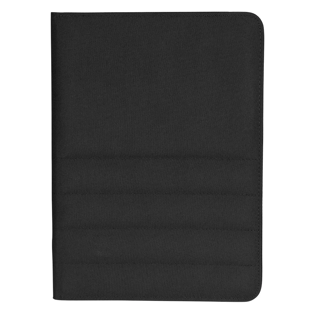 Portfolio sa blokom za beleške formata A4, namenjen poslovnoj i promotivnoj upotrebi. Tekstilna obloga u kombinaciji sa funkcionalnim rasporedom čini ga pogodnim za sastanke, konferencije i prezentacije. Opremljen je dodatnim džepovima za kartice, dokumenta i mobilni telefon, kao i držačem za olovku za praktičnu organizaciju. Korica je izrađena od RPET materijala (reciklirani PET), čime se ističe ekološki karakter proizvoda. Knjižni blok u linije sa 40 strana belog papira gramature 80 g/m² omogućava uredno beleženje.