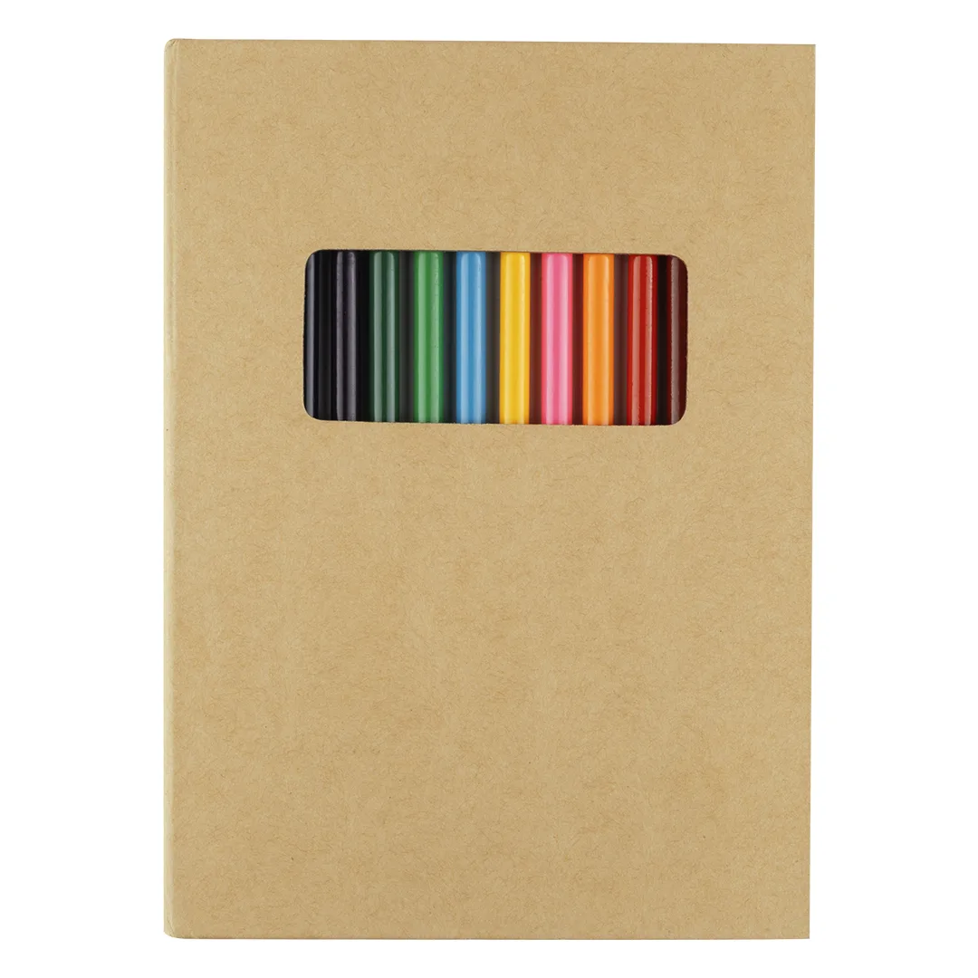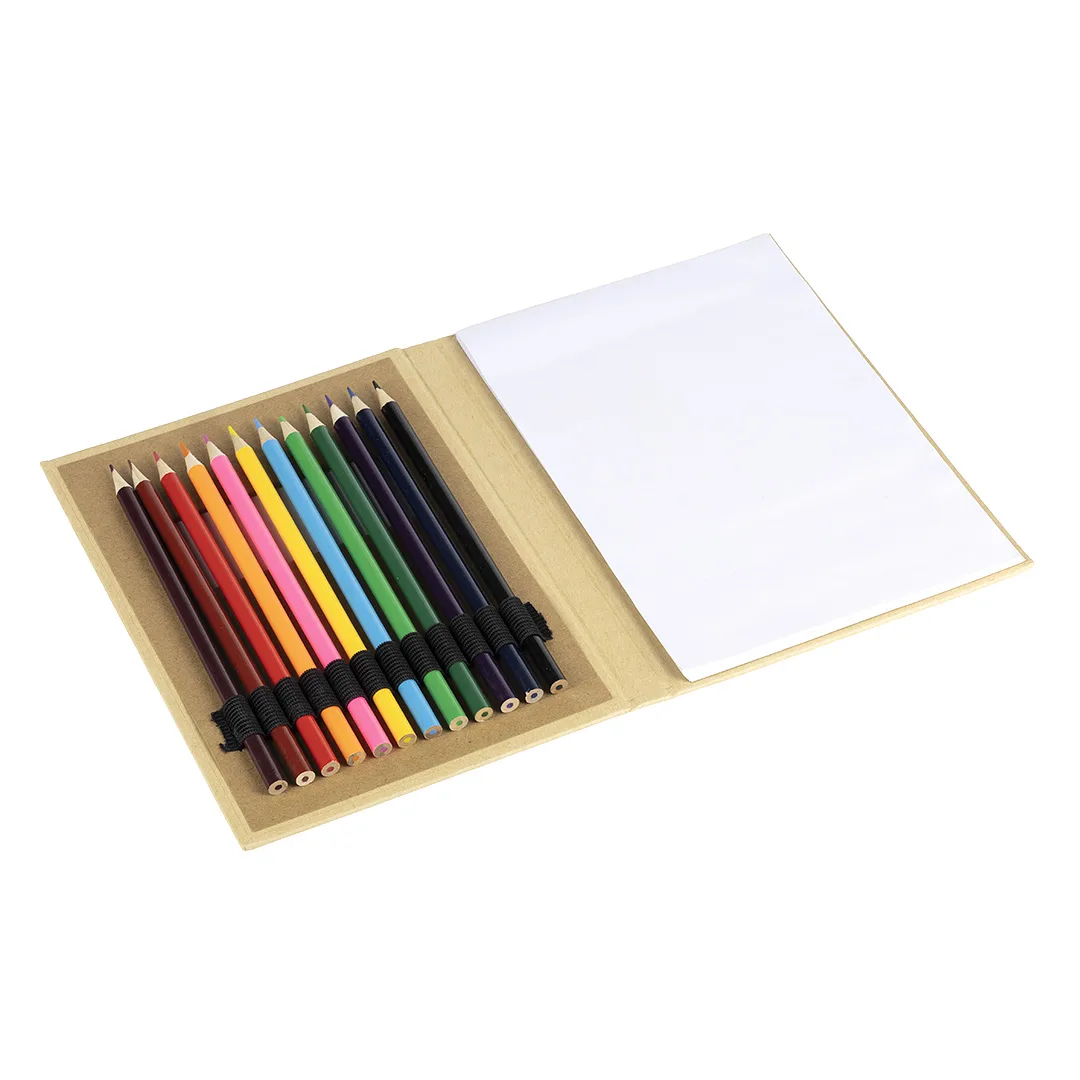 Set za crtanje koji sadrži 12 bojica i blok sa 70 praznih belih listova, namenjen kreativnim aktivnostima dece i učenika. Korice su izrađene od kartona, a prednja strana ima otvor koji omogućava brz pregled dela dostupnih boja bez otvaranja pakovanja. Praktičan izbor za školu, radionice i promotivne kampanje.
