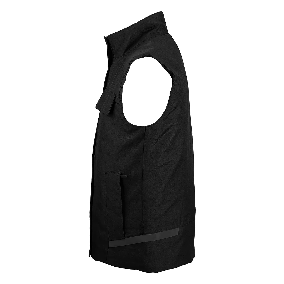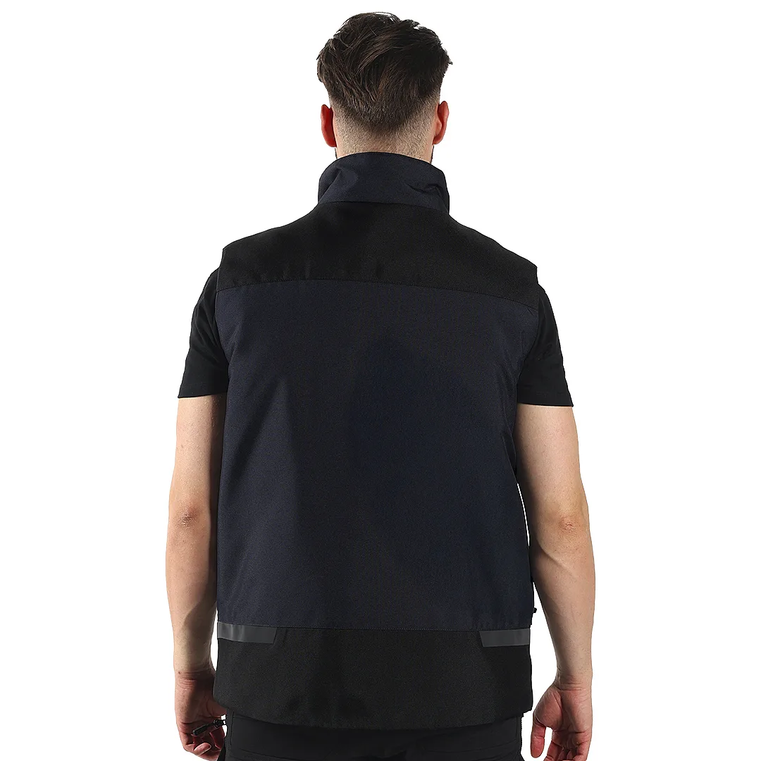 Prsluk ima visoku kragnu i centralno zatvaranje rajsferšlusom, a džepovi su organizovani za praktičan rad: tri džepa na grudima različitih dimenzija, dva prednja džepa i unutrašnji džep dimenzionisan za tablet ili veću opremu. Diskretni reflektivni detalji poboljšavaju uočljivost u slabijim svetlosnim uslovima, što ga čini pogodnim za industriju, logistiku, servisne i tehničke poslove, kao i terenski rad.