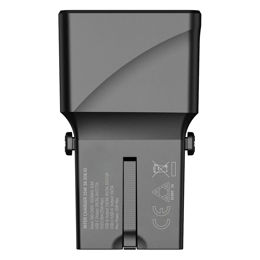 Univerzalni putni zidni punjač snage do 25W sa priključcima koji pokrivaju upotrebu širom sveta, namenjen punjenju mobilnih uređaja tokom putovanja. Opremljen je USB-C i USB-A portovima za istovremeno punjenje i koristi GaN tehnologiju za efikasno i stabilno napajanje. Isporučuje se u poklon kutiji.