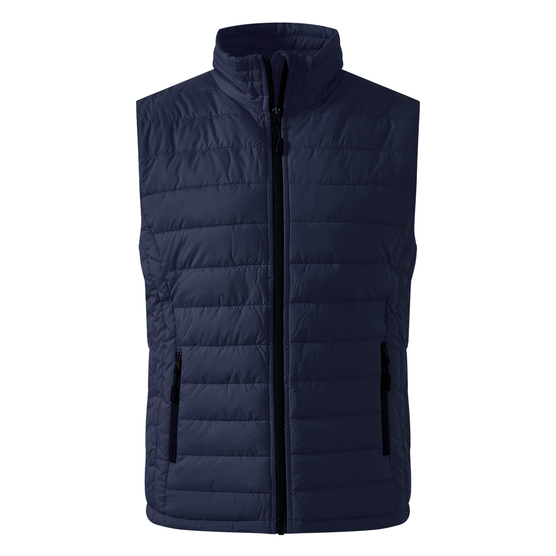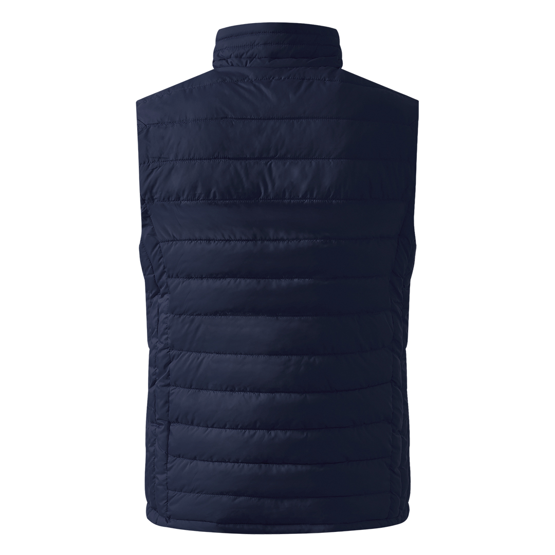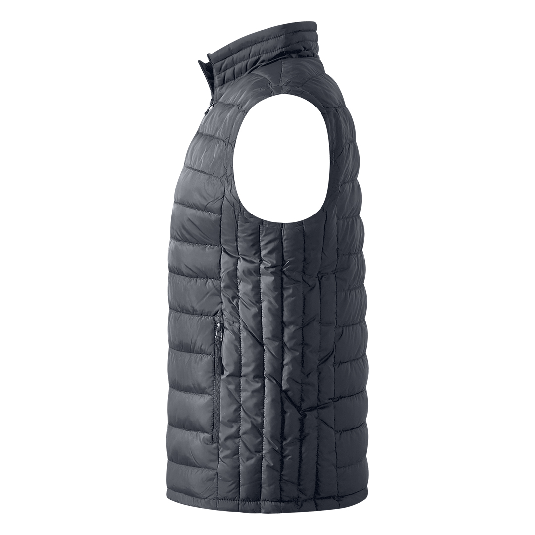 Prsluk sa laganim punjenjem, štepani, visoka kragna, dva prednja džepa sa rajsferšlusom i jedan unutrašnji džep, skriveni unutrašnji rajsferšlus na leđima za lakši pristup prilikom štampanja