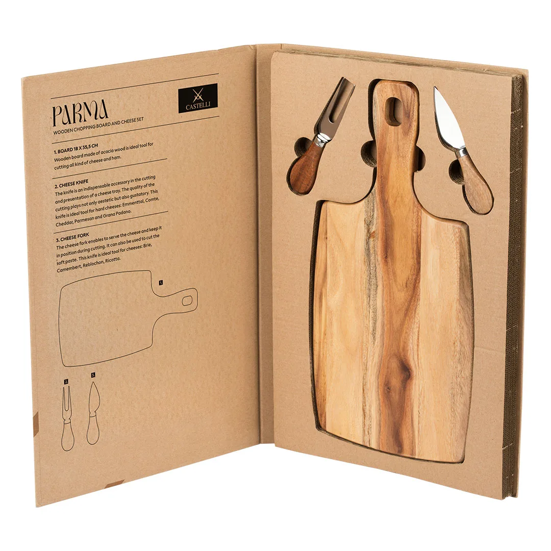 PARMA set za sireve osmišljen je kao idealan promotivni poklon za sve uživaoce dobrog sira i delikatesa. Set sadrži drvenu dasku namenjenu sečenju i serviranju, kao i dva noža prilagođena radu sa različitim vrstama tvrdih i mekih sireva. Daska je izrađena od drveta i pogodna je za personalizaciju laserskom gravurom, dok se noževi vizuelno i funkcionalno uklapaju u celinu seta. Proizvod dolazi u poklon pakovanju sa uputstvom sa unutrašnje strane i diskretnom štampom na spoljašnjoj strani, pri čemu se kutija može dodatno brendirati. PARMA set predstavlja kvalitetno rešenje za korporativne poklone, vinarije, gastro kampanje i promocije sa naglaskom na uživanje i deljenje.