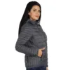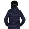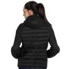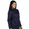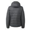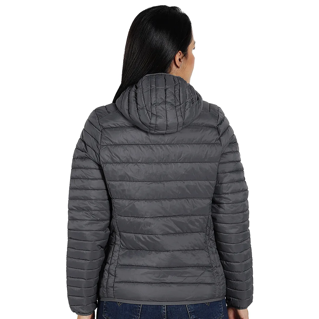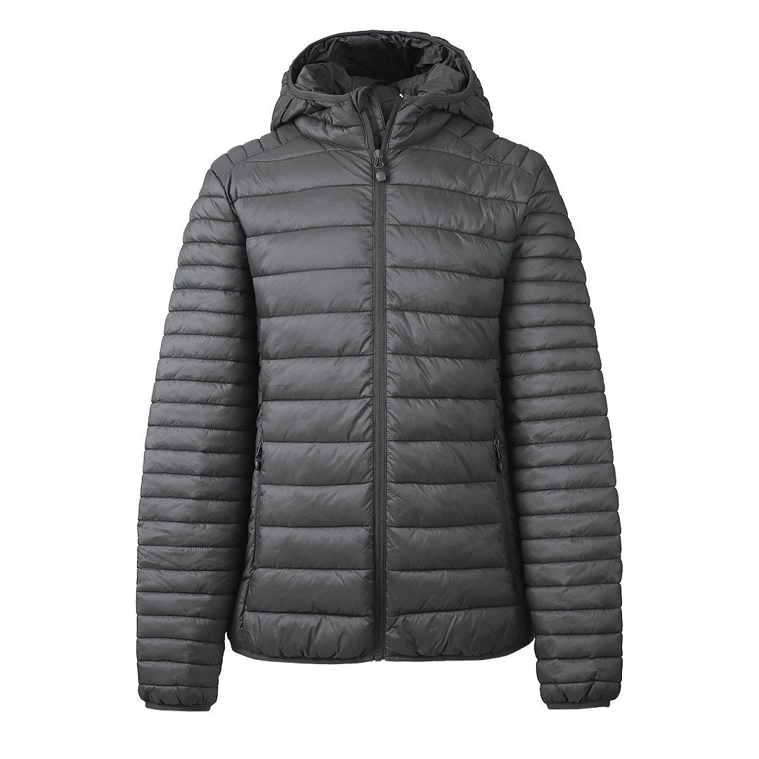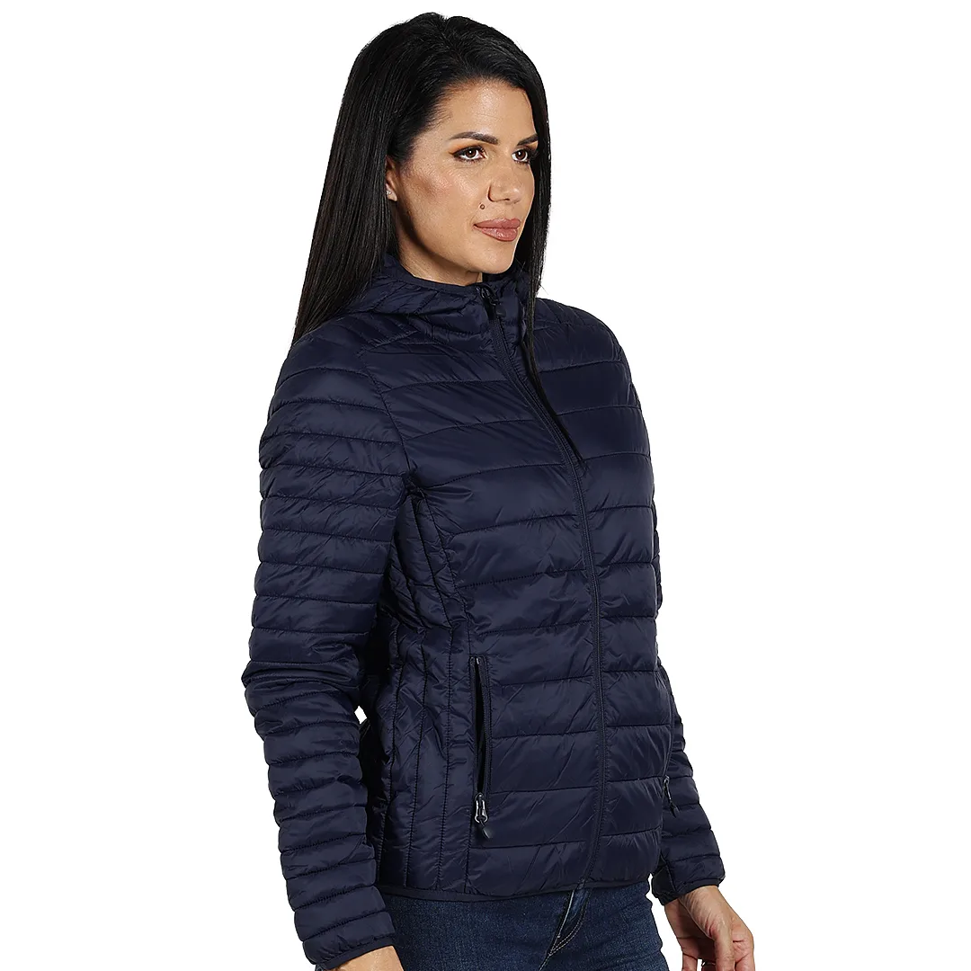 Ženska jakna sa laganim punjenjem, štepana, dva prednja džepa sa rajsferšlusom, elastičnim paspulima na rukavima, kapuljači i dnu, vrećica za pakovanje
